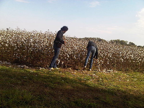 Guillermo Faivovich and Nicolás Goldberg picking transgenic cotton in Chaco Province, Argentina. May 21, 2011. Foto: Carolyn Christov-Bakargiev